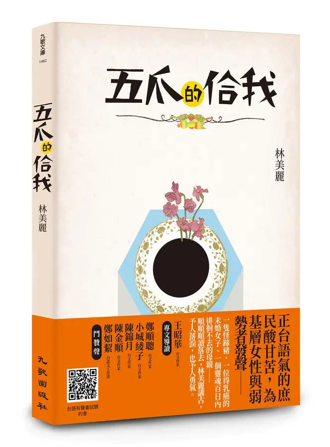 3林美麗的《五爪佮我》,我本底想講看看咧就好。朋友駛車載我去斗六耍,踅田納西書店,以早來過就足佮意這間冊店,文具佮冊品質無輸台中,這個月出版的冊店內就有賣,台語冊嘛有這誠稀罕。以早讀《台語現代小說選》的有節錄《八卦紅之心》,讀了誠鬱卒,若讀了規本感覺可能著無仝。《五爪佮我》讀著故事真活就共買落來。作者台語寫甲真純,毋過有幾若字我毋知按怎唸,規氣買有聲冊做伙讀。看冊皮花矸的烏空神神祕祕,嘛若人的目睭仁烏烏看袂透。