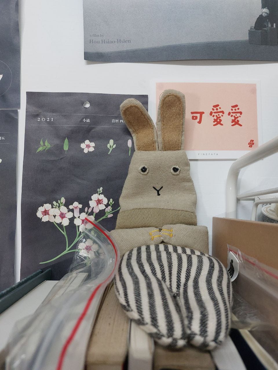 寒天手冷吱吱,寫字拍字無靈活。影著冊櫥仔有一隻兔仔尪仔,我雄雄想著伊腹肚內是亞麻仁籽,微波了後通做焐燒包,手摸著真緊著燒烙。這是佮繭裹子買的,公平貿易認證的公司。尼泊爾的臭耳聾婦女用布幼仔做尪仔,環保閣會當改善在地人經濟。幾若年前參加交換禮物,才熟似繭裹子,買來送朋友佮家己用。這馬尪仔欠貨,𪜶主要是咧賣衫仔,嘛有揹仔佮帽仔等等。品質好閣有理念我真佮意。